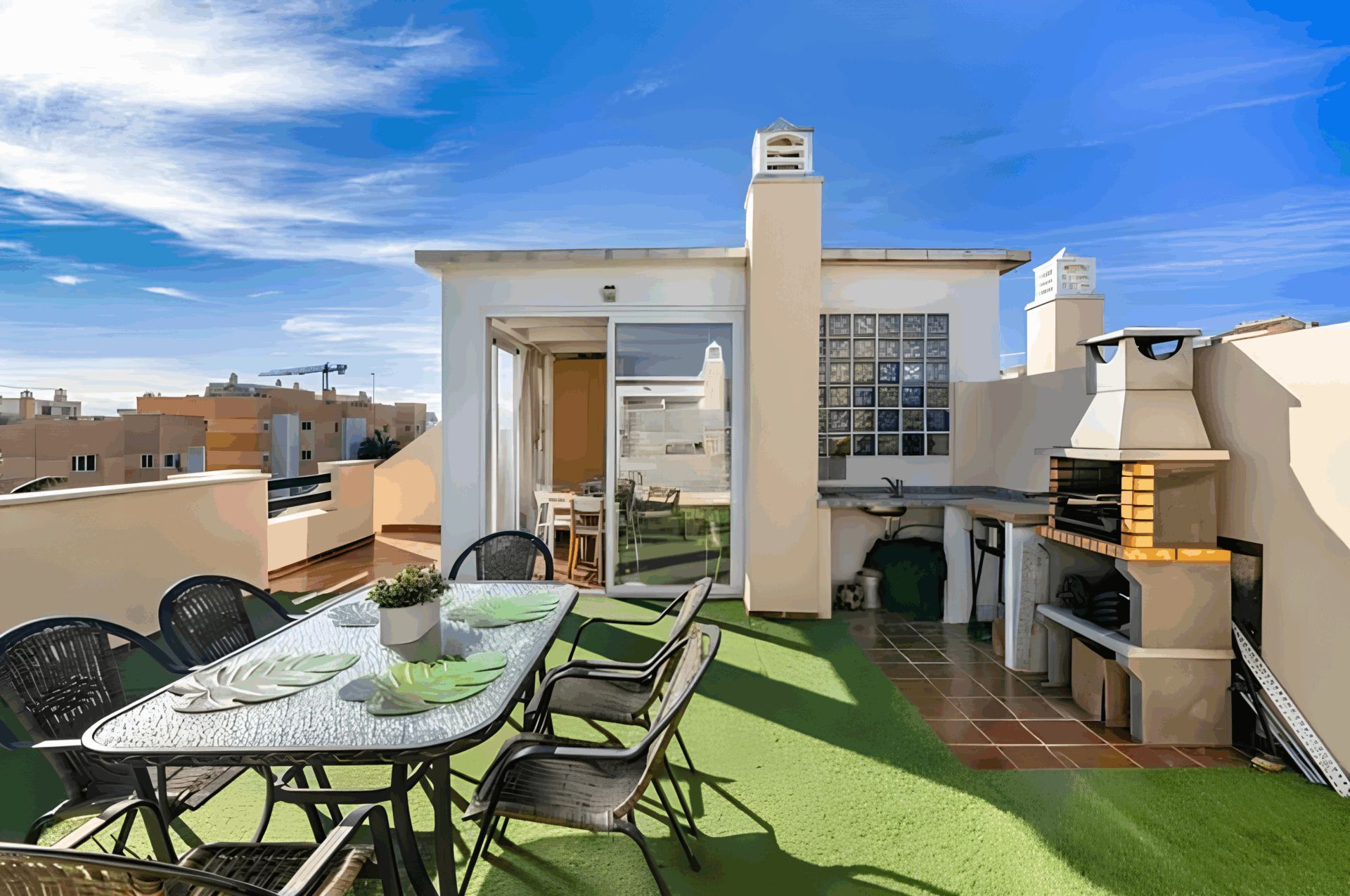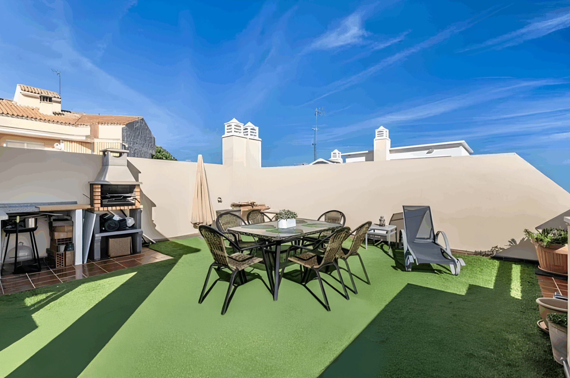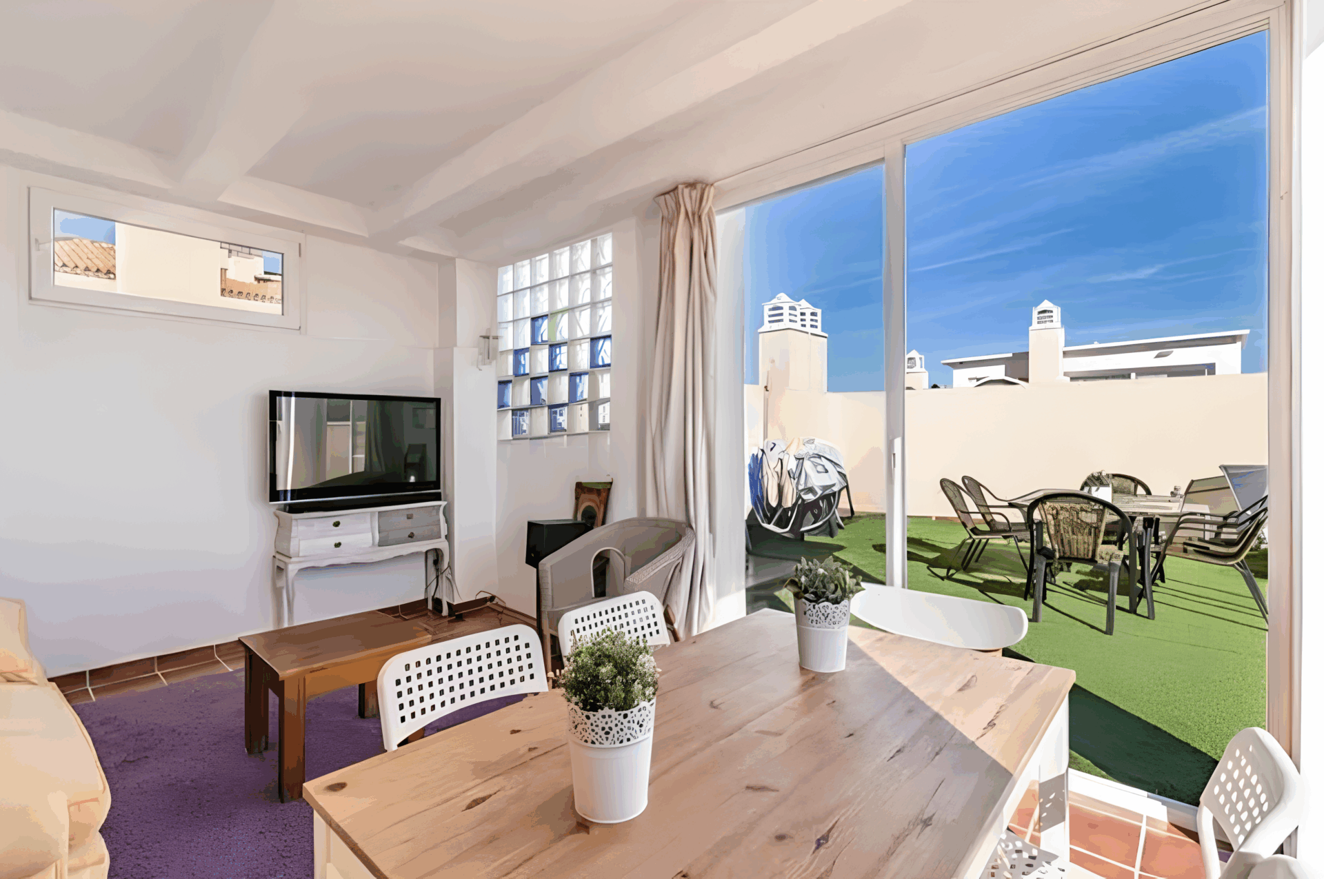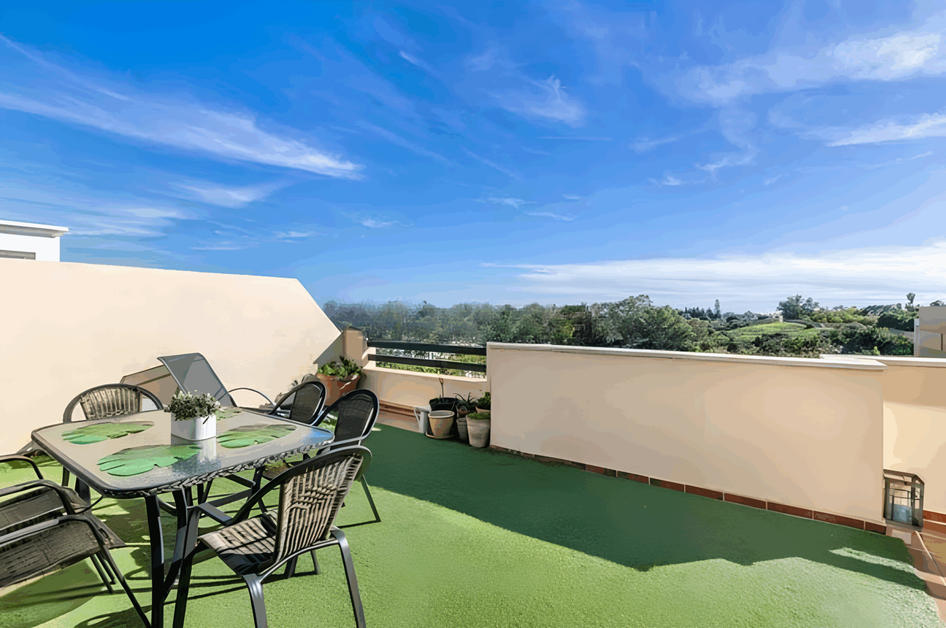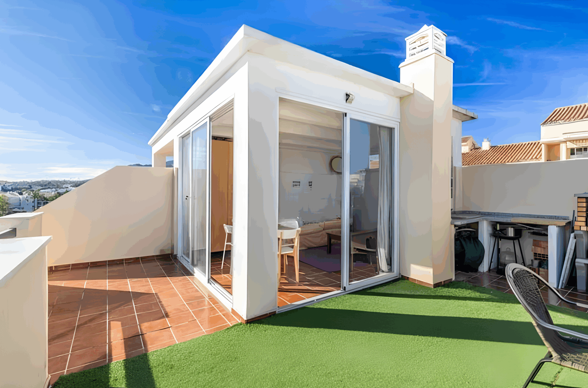 Discover this stunning 3-bedroom, 2-bathroom penthouse duplex located in the sought-after Selwo area of Estepona. Boasting a spacious 30 m² terrace with elegant glass curtains and a 60 m² solarium featuring a built-in charcoal barbecue, this home is designed for year-round outdoor living.